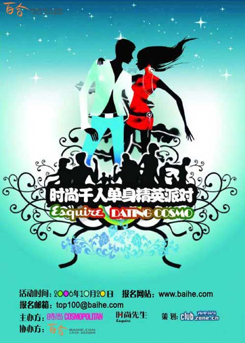 2006年10月20日,国际著名杂志《时尚》和《时尚先生》与专业派对机构“夜时尚”联手合作,举办2006年京城最大型的“千人精英单身派对”。这1000名京城内精英单身男女,是由众多报名者中精心挑选出来,男士的标准为事业有成的单身贵族,女士则为靓丽的知性美女。他们将收到《时尚》杂志社寄出的邀请函,凭借信函中含有神秘芯片的邀请卡,才可以打开当天会场的大门。